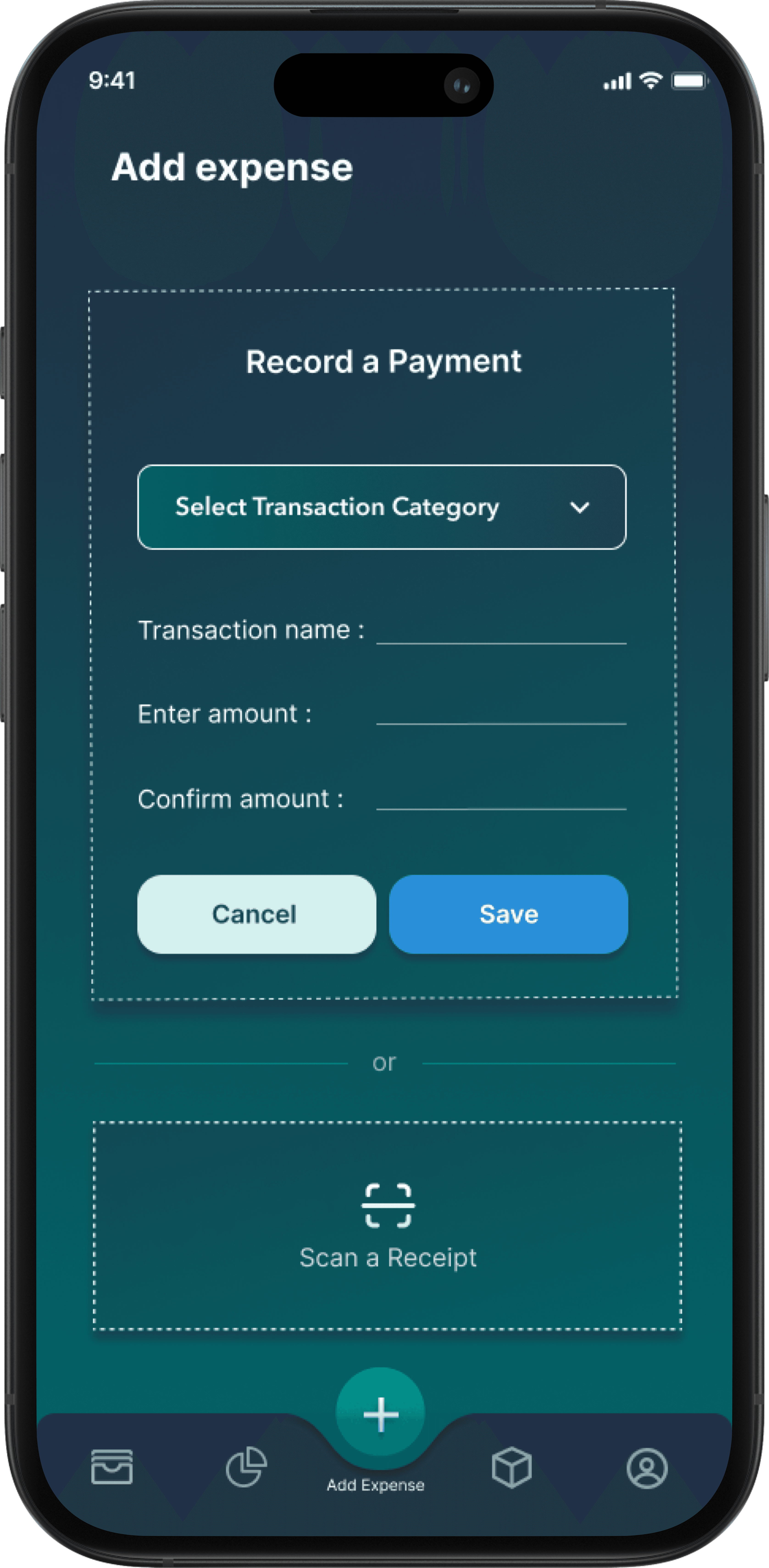 Users can quickly add expenses manually for full flexibility.